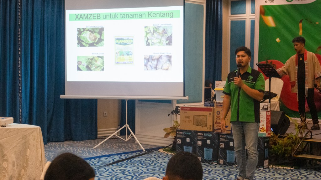 Aldi Sinuhaji salah satu Staff Field Assistant E-Tong memberikan solusi melalui produk-produk pestisida berkualitas, salah satunya adalah XAMZEB 4/64 WG, yang akan menjadi solusi utama bagi petani tanaman kentang. Selain itu, XAMZEB 4/64 WG juga dapat digunakan pada tanaman sayur lain seperti tomat, cabai, bawang merah, dan lain-lain.