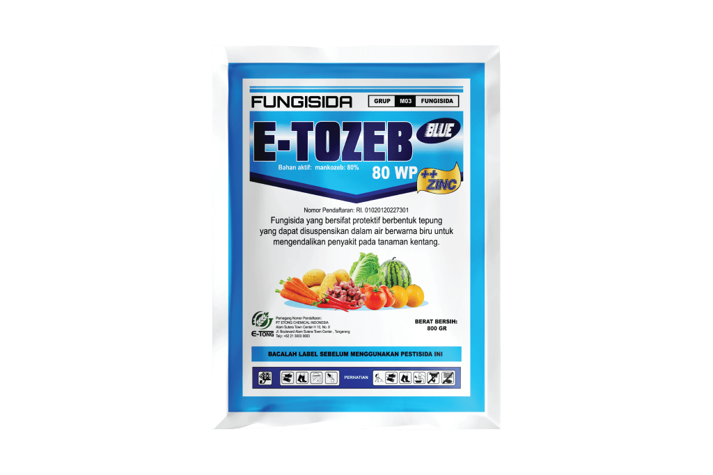 E-TOZEB BLUE 80 WP merupakan fungisida yang bersifat protektif untuk mengendalikan berbagai penyakit pada tanaman sayuran dan buah-buahan. E-TOZEB BLUE 80 WP mempunyai formulasi yang berwarna biru dan tingkat kelarutan yang tinggi sehingga disenangi oleh banyak petani di Indonesia.